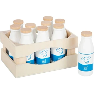 The robust wooden crate contains 10 milk bottles made of solid wood in a visually appealing design Simple illustrations on the milk packaging allows younger children to understand the contents even if they can't read yet Ideal add-on item for play stores and play kitchens for role-playing realistic, everyday situations in the play store or play kitchen Role play promotes the development of children's creativity and communication skills from kindergarten age to primary school age Crate approx. 14 x 10 x 7 cm; Milk bottle height approx. 9 cm, Ø approx. 3 cm, Manufacturer: small foot