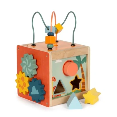 FSC 100%: This product is made entirely of wood from FSC-certified forests Motor activity cube with two bead mazes, a shape-fitting game, a sliding maze, a spinning tiles game, and gears on five playable sides The removable lid can be turned around and stored inside the cube in a space-saving way Cute dinosaur motifs inspire the imagination and encourage storytelling Approx. 15 x 15 x 25 cm, Manufacturer: small foot