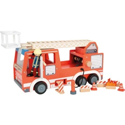 Detailed wooden fire engine with 360° rotating, extendable ladder with basket that can be attached magnetically Truck with versatile accessories, including a fireman's doll, 3 barriers, 2 pylons and a hydrant which can be coupled to the vehicle A retractable hose with magnetic coupling and a water sprayer with holding loop allow for realistic fire brigade operations Easy-to-open doors with an acrylic windscreen in the driver's cab and two flaps provide practical storage space Thanks to the pull-out support legs, this fire engine can be parked safely during use, Manufacturer: small foot