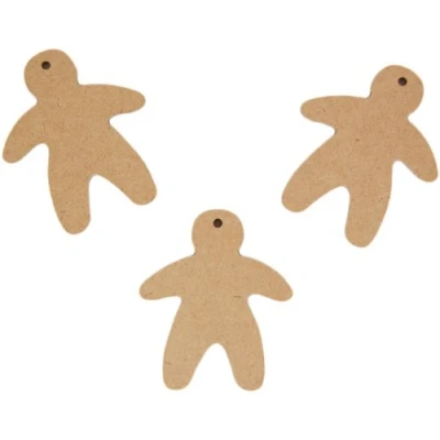 AmazonPack of MDF hanging tags in the shape of gingerbread men / people with holes for hanging Pack includes 3 Gingerbread men 8.5cm H x 7cm W x 0.3cm D Supplied plain ready to paint / decorate with acrylics poster paints stamps napkins glitters embellishments decoupage / Decopatch etc. Part of a range of wooden shapes