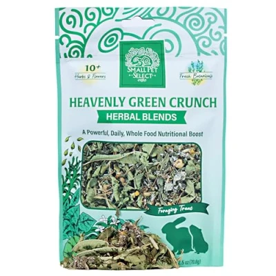 Pet Compatibility: Recommended for rabbits and guinea pigs Natural Ingredients: Made with human-grade whole foods in their natural state for optimal bioavailability Nutritional Variety: Provides diverse blend of herbs to mimic natural foraging behavior Product Type: Herbal treat blend specifically formulated for small pets' dietary enrichment Package Size: Contains 2.5 ounces of Heavenly Green Crunch Blend herbal mixture