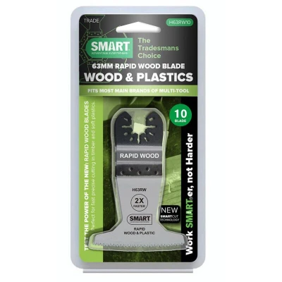 General description A Trade Series rapid wood blade specifically designed for extremely fast and precise cuts in wood, hardwood, and plastic. The ‘rapid wood’ toothing provides cutting speeds up to two times faster than conventional blades, making it ideal for longer, wider cuts such as cutting out for socket boxes and installing flooring. The Trade Series contains a wide range of high-quality multi-tool blades and accessories designed to equip trade users with an accessory for any requirement. Technical specifications Blade Width: 63mm (2 1/2 inches) Cutting Depth: 52mm (2 inches) Fitment Type: Universal Open-back (not Starlock) Usage Perfect for extremely fast and precise cuts in wood, hardwood, plastic, and more. Ideal for longer, wider cuts such as cutting out for socket boxes and installing flooring. Other information Includes a pack of 10 blades.