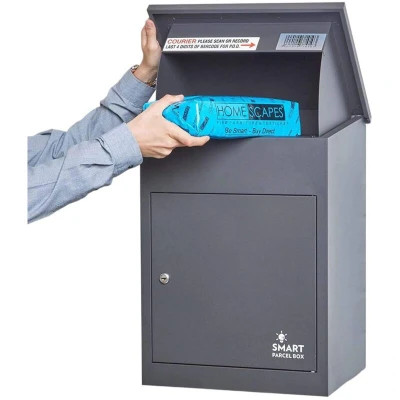 ManoManoGeneral description Secure, medium-sized parcel delivery drop box designed for small to medium-sized parcels. The Smart Parcel Box® features a secure locked door that keeps your parcels safe when you're not at home. It is suitable for both wall and floor mounting, making it a versatile option for any property. Technical specifications Brand: Smart Parcel Box® Dimensions: W 440 x D 350 x H 580 mm Colour: Grey Material: 7mm Galvanised Steel Lockable: Key lock with 3 keys Weather-Resistant: Powder coated with floor raisers Max Parcel Size: 320 x 205 x 120 mm Warranty: Manufacturer's Warranty of up to 3 years Installation Each Smart Parcel Box® is delivered with appropriate fixtures and fittings. Please ensure that these are compatible with your property before installation. Usage The Smart Parcel Box® is designed to receive deliveries when you are not at home. Parcels simply sit in the holding compartment and can be retrieved using your access key. Each parcel box also has its own unique