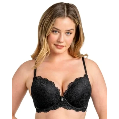 Adds 2 cup sizes instantly! This bombshell bra with molded double bump, push-up padding lifts you upward and inward adding the cleavage and fullness you crave. This extreme push-up bra is complete with underwire support for an added, upward lift. The best push-up bra for low-cut tops, the plunge neckline highlights your new-found full cleavage. This push up bra also works well under tight fitting clothing to create a more hourglass looking figure. Available in all over lace for special occasions, smooth cups with delicate lace wings and mesh or satin fabric to lay smooth under clothes for everyday wear. Available in smooth micro, mesh or satin, and lace t-shirt bras, the detailing makes this your most beautiful basic yet.