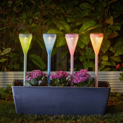AmazonSOLAR POWERED: Charges efficiently in direct sunlight during the day and automatically activates at dusk for hassle-free illumination COLOUR VARIETY: Set includes four decorative stakes in vibrant pink, blue, peach, and green hues for diverse garden lighting WEATHER RESISTANT: Durable plastic construction withstands outdoor conditions whilst maintaining aesthetic appeal DIMENSIONS: Each stake measures 43 cm in height, providing optimal ground-level garden illumination VERSATILE DESIGN: Perfect for illuminating garden paths, flower beds, and outdoor entertainment spaces with colourful ambient lighting
