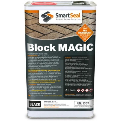 General description Smartseal Block Magic is a premium blend of liquid pigments and acrylic resins designed to rejuvenate and protect block paving driveways and patios. It effectively restores the color lost due to sun exposure, rain, vehicles, and pressure washing, ensuring a vibrant and long-lasting finish. This product is suitable for use on most block paving surfaces, but should not be applied to clay pavers or in combination with polyurethane products. Technical specifications Volume: 5 Litres Coverage: Approximately 3 m²/litre (2.5 m²/litre on old pavers) Application method: Roller Drying time: 3 hours before re-sanding; tack-free within 2 hours at 20°C Foot traffic allowed after 4 hours; vehicles after 24 hours at 20°C Temperature range for application: 12°C to 23°C Flash point: 40°C (Abel-Closed Cup) Installation Pressure wash the paving to remove all debris and contaminants. Allow the paving to dry for 5 clear and dry days. For original sand color: Apply one coat of Block