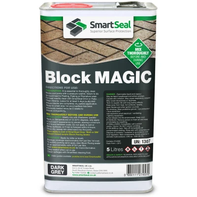 General description Smartseal Block Magic is a premium blend of liquid pigments and acrylic resins designed to rejuvenate and protect block paving driveways and patios. This product effectively restores the color lost due to sun exposure, rain, vehicles, and pressure washing, ensuring your paving looks like new. It is suitable for application on old block paving, with the possibility of requiring two coats for a uniform finish. Technical specifications Volume: 5 Litres Coverage: Approximately 3 m²/litre (around 2.5 m²/litre on old pavers) Application method: Roller Drying time: 3 hours before re-sanding; tack-free within 2 hours at 20°C Foot traffic: Allowed after 4 hours; vehicles should be kept off for a minimum of 24 hours at 20°C Temperature range for application: Between 12°C and 23°C Flash point: 40°C (Abel-Closed Cup) Installation Ensure paving is pressure washed to remove all debris and dirt from joints. Leave paving to dry for 5 clear and dry days. For original sand color: