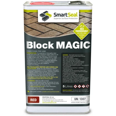 General description Smartseal Block Magic is a premium blend of liquid pigments and acrylic resins designed to rejuvenate and protect block paving driveways and patios. This product effectively restores the color lost due to sun exposure, rain, vehicles, and pressure washing, ensuring your paving looks like new. It is important to note that old or poorly conditioned pavers may require two coats for a uniform finish. Block Magic is not suitable for clay pavers or for use in combination with polyurethane products. Technical specifications Volume: 5 Litres Coverage: Approximately 3 m²/litre (around 2.5 m²/litre on old pavers) Application method: Roller Drying time: 3 hours before re-sanding; tack-free within 2 hours at 20°C Foot traffic permissible after 4 hours; vehicles should be kept off for a minimum of 24 hours at 20°C Temperature range for application: 12°C to 23°C Installation Pressure wash the paving to remove all surface debris and muck from joints. Leave the paving to dry for 5