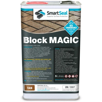 General description Smartseal Block Magic is a premium blend of liquid pigments and acrylic resins designed to rejuvenate and protect block paving driveways and patios. This product effectively restores the color lost due to sun exposure, rain, vehicle traffic, and pressure washing, ensuring your paving looks like new. It is suitable for application on old or poorly conditioned pavers, which may require two coats for a uniform finish. Please note that Block Magic should not be used on clay pavers or in combination with polyurethane. Technical specifications Volume: 5 Litres Coverage: Approximately 3 m²/litre (2.5 m²/litre on old pavers) Application method: Roller Drying time: 3 hours before re-sanding; 2 hours between coats Foot traffic: Allowed after 4 hours at 20°C Vehicle traffic: Avoid for 24 hours at 20°C Temperature range for application: 12°C to 23°C Flash point: 40°C (Abel-Closed Cup) Installation Pressure wash the paving to remove all surface debris and muck from the joints.