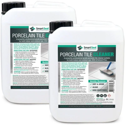 General description Smartseal Porcelain Tile Cleaner is a powerful cleaner designed to effectively remove ingrained dirt, grime, algae, bird droppings, and other surface contaminants from all types of porcelain tiling. It is particularly effective as a porcelain patio cleaner and is suitable for both internal and external surfaces. This cleaner prepares the surface for the application of the Porcelain Tile Sealer, ensuring a thoroughly clean base. Technical specifications Coverage: Up to 10m² per litre, depending on porosity and level of surface contamination Directions for use: Outdoors - Dilute concentrate at 1:4 with clean water, apply with sprayer or watering can, rinse off after 30 mins or pressure wash for heavier contamination Directions for use: Indoors - Dilute concentrate at 1:4 with clean water, apply with a mop, sponge, or brush, allow to dwell for 15-30 mins, agitate with a stiff broom or brush, rinse off with clean water Storage: Store in a cool, dry area away from