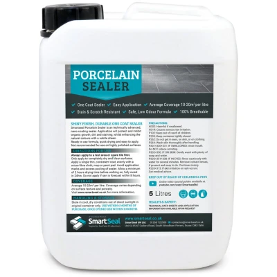 General description Smartseal Porcelain Sealer is a hard-wearing, breathable protective coating designed for modern internal and external porcelain tiles. It is also suitable for use on ceramic wall and floor tiles, helping to prevent general soiling and surface staining. While not a cosmetic product, it enhances the natural colors of the tiles and leaves a subtle wet look sheen once dry, making cleaning and maintenance easier. Technical specifications Volume: 5 Litres Average coverage: 10 - 20 m² per litre, depending on surface texture and porosity Application temperature range: 10° to 23°C Installation Always apply to a test area or spare tile first. Only apply to completely dry and clean surfaces. If a sweep-in pointing compound has been used within the last 6 months, clean the porcelain with Smartseal Residue Remover prior to application. Apply a single thin, consistent coat using a microfibre cloth, microfibre flat mop, or paint pad. Avoid application marks and excess pooling of