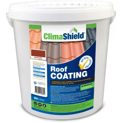General description Climashield Roof Coating is designed to rejuvenate the appearance of aging, porous concrete roof tiles. This product surpasses traditional roof paint by not only transforming the look of old tiles but also acting as a waterproof sealer. Available in various colors including Burgundy, it provides long-lasting protection against UV light and weather conditions, ensuring that your roof remains aesthetically pleasing and durable for years to come. Technical specifications Volume: 20 Litres Type: Environmentally friendly water-based acrylic Application temperature: Above 12 °C Average coverage: 4m² - 6m² per litre Water vapour permeability: Yes Flexibility: Allows for movement within roof tiles UV resistance: Tested to European Standards Freeze-thaw resistance: Tested with no mechanical damage Adhesion: Strong adhesion to concrete roof tiles Installation Thoroughly clean the roof using a pressure washer and treat with a biocide to eliminate moss and algae. Ensure the