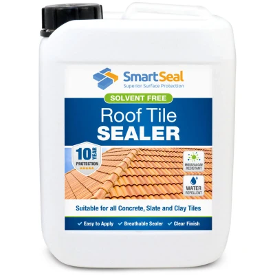 General description Smartseal roof sealer creates a water-repellent barrier and protects against the re-growth of moss and algae. This high-quality, clear, solvent-free acrylic impregnating roof sealer is suitable for concrete, clay, or slate tile roofs. Once applied, it alters the chemical structure of the roof tiles, providing an excellent water-repellent surface while greatly restricting the growth of algae, lichen, and moss. Technical specifications Volume: 5 litres Coverage: Up to 125 m² on concrete roof tiles; 200-250 m² on clay and slate roof tiles Average coverage: 5 m² per litre Touch dry: 2-3 hours Fully waterproof: 24 hours Lifespan: Up to 10 years Solvent-free Preparation Ensure tiles or slates are clean, dry, and free from moss or algae spores. Pressure washing and application of a suitable biocide is essential unless applied to a new roof. Application Apply by hand-held sprayer or brush to saturation. After 20-30 minutes, apply a light second 'wet on wet' coat. Do not