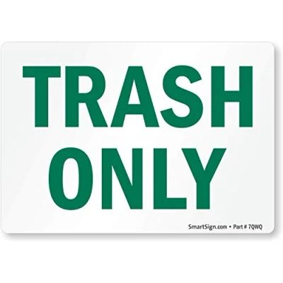 DURABLE POLYESTER: 'Trash Only' labels are made from 3 mil thick conformable laminated polyester that has 5-year outdoor life and aggressive adhesive backing. EASY INSTALLATION: Material has an aggressive adhesive backing. Just remove the liner and apply the label to any clean surface. Labels stick to flat or curved surfaces and can be used indoors or outdoors. LAMINATED PROTECTION: UV-resistant, weatherproof overlaminate protects the label from moisture, solvents, chemicals, abrasion and fading. Easily wipe off graffiti, dirt, dust, or grease. GLOSSY FINISH: Labels look premium and can be spotted easily with their glossy finish, easy to clean and mar-resistant. The surface may be written on with permanent marker. PACK CONTENTS: One 3.5 x 5 inch green and white Label.