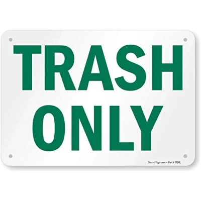 Legend "TRASH ONLY" Lyle Signs supplies your sign with radius corners for safety and holes punched one in each corner for easy installation This Lyle Safety sign is designed to last up to 5 years for outdoor applications and longer for indoor applications Lyle Safety signs meet OSHA 1910.145 requirements This Lyle Safety sign is abrasive and chemical resistant