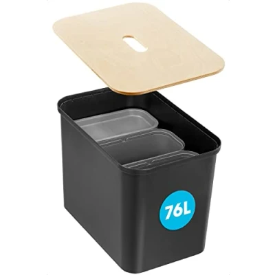 KITCHEN BIN RECYCLING AND WASTE - Keep a tidy home with SmartStore kitchen recycling bins. Their generous 76L capacity gives you plenty of room to store all your recyclable waste, Includes 1x 76L container, 1x wooden lid, 3x 13L bucket inserts, 2x small lids. RECYCLE BINS FOR KITCHEN WITH COMPARTMENTS - 3 smaller 13L buckets with ergonomic handles for easy removal let you separate different types of recyclables inside the larger bin. You can also use the buckets individually or in cabinets and drawers for general storage purposes. STYLISH BINS FOR KITCHEN RECYCLING AND WASTE - Made in Finland from wood and recycled plastic, the minimalistic Scandinavian design looks good in any setting and is easy to clean. STURDY PLASTIC BIN - The waste bin has reinforced corners for optimum strength, and with the wooden lid can comfortably support someone sitting on it (up to 100kg). If you remove the bucket inserts, it can even function as a practical shoe storage bench in your hallway. HIGH QUALITY KITCHEN BINS - We believe this bin is built to last, so as part of SmartStore's promise we offer a 10-year manufacturers guarantee on all of our storage bins and boxes.