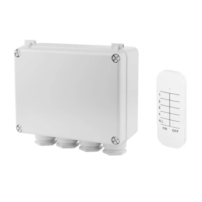 Lights.co3-channel wireless switch box SH4-99652 for outdoor use including remote control The 3-channel switch box SH4-99652 is designed for outdoor use (IP55) and enables the control of several lights or devices with the supplied multi-channel remote control. The remote control offers a range of 25 m and easily penetrates doors, walls or ceilings. In addition to the individual channels for the connected lights or devices, it also has a master channel that can be used to switch all connected consumers on or off together. For example, the entire garden lighting can be controlled at the touch of a button - Radio frequency: 433.92 MHz - Connections: 1 x input, 3 x output - Total power of connected loads: max. 400 W per channel - Battery for remote control: 1 x CR2032