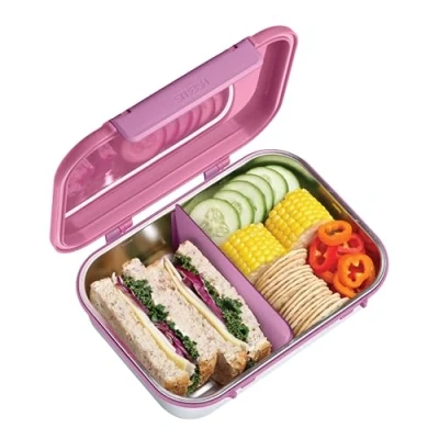 Smash 1.8L/61oz Microwave Safe Stainless Steel Bento Box with Pink Hinged Lid 2 Compartments Movable Divider, Leak Proof Clip Closure & Silicone Seal