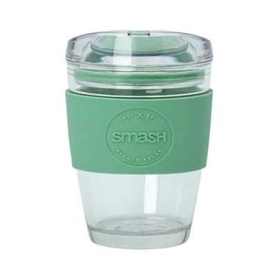 Smash Glass Coffee Cup 350ml / 8oz Sage Reusable Borosilicate with Protective Silicone Sleeve, Splash Proof Lid, Barista Friendly