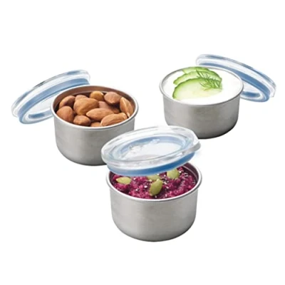 The Smash Microwave Safe Stainless Steel Dressing Pots are completely leak proof and airtight, perfect for storing and transporting everything from dressings and sauces to your favourite snacks like nuts or dried fruit. Available in a set of three, each pot is microwave safe and fits perfectly inside the Smash microwave safe stainless steel bento and meal box. MICROWAVE SAFE Yes, you read that right! Our stainless steel containers can be used in the microwave, simply remove the lid and heat in 30 second increments, stirring in between until you reach your desired temperature. Always take care and use an oven mitt when removing the container. LEAK PROOF/ AIRTIGHT The leak proof silicone perimeter seal prevents unwanted leaks and spills, whilst also being airtight to lock in freshness. For those who like their dressing on the side, these little guys are the perfect companion to our stainless steel 3 compartment bento and meal box, fitting perfectly inside. SUSTAINABLE STAINLESS STEEL Engineered with food grade stainless steel and paired with Tritan lids which give glass like clarity without the risk of shattering, our microwave safe stainless-steel range has been developed with high quality, durable materials that are built to last. So, you can choose to reuse, over and over again. EASY TO CLEAN Our microwave safe stainless steel containers are top rack dishwasher safe., Weight: 0.28219169536 Pounds, Manufacturer: Smash
