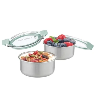 The Smash Microwave Safe Stainless Steel Snack Pots boast a generous 200ml capacity and are the perfect companion for wet or dry snacks on the go. From crunchy nuts to refreshing fruits or creamy yoghurts, these two leak proof containers have you covered. MICROWAVE SAFE Yes, you read that right! Our stainless steel containers can be used in the microwave, simply remove the lid and heat in 1-minute increments, stirring in between until you reach your desired temperature. Always take care and use an oven mitt when removing the container. LEAK PROOF/ AIRTIGHT The leak proof silicone perimeter seal prevents unwanted leaks and spills, whilst also being airtight to lock in freshness. Preserving your snacks' flavor and texture is our priority. SUSTAINABLE STAINLESS STEEL Engineered with food grade stainless steel and paired with Tritan lids which give glass like clarity without the risk of shattering, our microwave safe stainless-steel range has been developed with high quality, durable materials that are built to last. So, you can choose to reuse, over and over again. EASY TO CLEAN Our microwave safe stainless steel containers are top rack dishwasher safe.