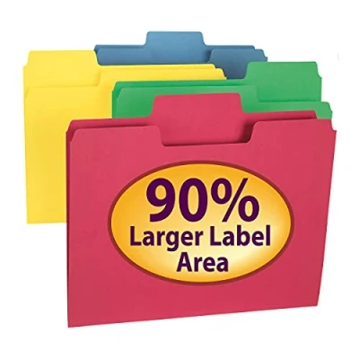 Easily spot the files you need with these letter size file folders (11-5/8" W x 9-1/2" H overall, 8-5/8" H body) that feature a 1/3-cut oversized tab for labeling folder contents with greater detail Oversized tabs in assorted positions provide nearly double the labeling area of standard folders so you can write larger or fit more lines of text, making your files easier to see and faster to find Durable 11 point colored paper stock protects important papers and makes it easy to quickly find what you need while the 3/4” expansion allows for greater storage capacity—perfect for everyday use Organize your files by color to speed up filing and retrieval time with this colorful solution, perfect for bills, recipes, projects, correspondence, vehicle records, client information and more Made in the USA, these top tab file folders contain 10% recycled content, 10% post-consumer material and are SFI Sourcing Certified; Designed to fit any vertical or lateral filing system