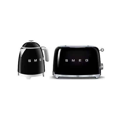 Smeg 50’s Style Retro Range Breakfast Set, 0.8L 1400W Mini Kettle and Multi Functional Control 2 Slice 950W Toaster, Black, KLF05BLUK/ TSF01BLUK