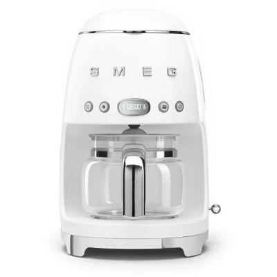 ManoManoThe SMEG DCF02WHEU filter coffee maker has a power of 1050W and a capacity of 10 cups. Its glass carafe with chrome handle and its chrome base give it an elegant design. It has a digital LED screen and an intuitive control panel. The 1 to 4 cup function allows you to select half a pot of coffee.