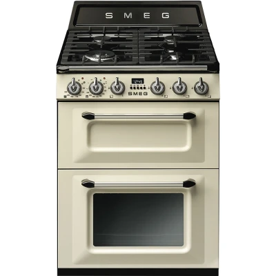 #html-body [data-pb-style=WEYM19G]{justify-content:flex-start;display:flex;flex-direction:column;background-position:left top;background-size:cover;background-repeat:no-repeat;background-attachment:scroll;border-style:none;border-width:1px;border-radius:0;margin:0 0 10px;padding:10px}#html-body [data-pb-style=I24N8BQ]{border-style:none;border-width:1px;border-radius:0;margin:0;padding:0}Enjoy the best of both worlds with the Smeg TR62 Dual Fuel Cooker which offers the instant heating of a gas hob and the controllable temperatures of twin electric ovens. It has tons of appeal thanks to the dual fuel format and chunky, retro styling. Gas hobFour burners range from a 1kW simmering ring up to a 4.2kW ultra-rapid zone, both conventiently located to the front of the cooker. It has automatic ignition, meaning you can use your right hand to switch on a burner, while stirring a pot with your left. All burners have safety valves and heavy duty cast iron supports. Multifunction ovensThe 61-litre capacity large, bottom oven has fan heating and four cooking levels. It also has a large viewing window to watch your cakes rising to perfection. The smaller, top cavity is a conventional convection oven with a grill. It also offers bottom heating only and half-width grilling. It has a capacity of 35 litres and two cooking levels. Additional benefitsBoth ovens have air cooling systems to keep surfaces safe-to-touch and special enamel interiors designed to make cleaning quick and easy. The cooker has a digital electronic clock which can be used to programme the main oven. AccessoriesThe cooker comes complete with a telescopic guide shelf to help you get big big pots and dishes in and out of the ovens, as well as three standard chrome shelves. There is also an extra-deep, 40mm deep tray, a cast-iron Wok support and two grill-try meshes.