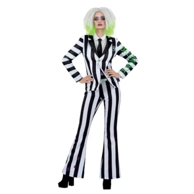 OFFICIAL BEETLEJUICE DELUXE COSTUME: Embrace the mischievous charm of Beetlejuice with this high-quality costume, officially licensed & featuring the iconic black-and-white striped jacket, flared trousers, & tie. This outfit captures the spirit of the character, making it a hit for Halloween, & more. DISTINCTIVE FLARED TROUSERS DESIGN: Stand out with the uniquely styled flared leg trousers, adding a dramatic twist to the classic Beetlejuice look. Paired with the striped jacket and coordinating tie, this costume offers a modern take on the character's traditional attire. CLASSIC BEETLEJUICE STRIPES WITH ADDED DETAIL: The jacket boasts the famous Beetlejuice writing down the sleeve, enhancing the authenticity & appeal of the costume. This detail, along with the bold stripes throughout the costume, ensures you'll capture everyone's attention at any event. COMFORTABLE FIT FOR ALL NIGHT WEAR: Designed for both style & comfort, the costume's flared trousers & tailored jacket offer a flattering & comfortable fit, allowing you to enjoy the festivities without restriction. The tie completes the costume, ensuring a polished and put-together look. COORDINATE WITH MATCHING FAMILY COSTUMES: Take your event to the next level by pairing this adult costume with matching family costumes. Whether trick-or-treating with the kids or attending a themed party with friends, this Beetlejuice costume is perfect for group costumes., Manufacturer: Smiffys