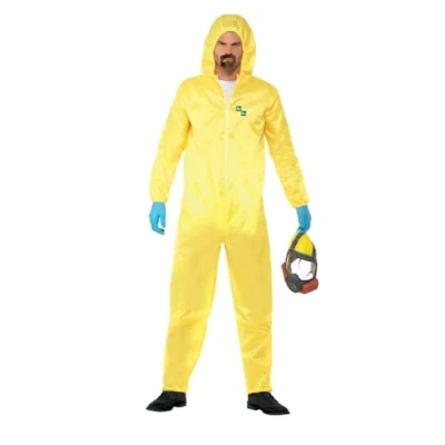 OFFICIAL BREAKING BAD HAZMAT COSTUME: Transform into the iconic Heisenberg with this officially licensed Breaking Bad costume. Complete with a yellow hazmat suit, latex mask, gloves, & a stick-on goatee, this costume captures the essence of the show, perfect for Halloween HIGHLY DETAILED AND AUTHENTIC DESIGN: Emulate Walter White's alter ego with precision. The yellow boiler suit features a working zip for functionality & authenticity, while the included latex mask offers a realistic representation of Heisenberg's intense demeanor. COMPLETE SET WITH ICONIC ACCESSORIES: This costume includes all necessary accessories to complete your transformation: durable gloves, a self-adhesive goatee for easy application, & a comfortable latex mask that adds to the dramatic effect of the character portrayal. VERSATILE AND COMFORTABLE FIT: Designed to fit a variety of sizes, the hazmat suit allows for a comfortable fit that is suitable for prolonged wear at parties or during trick-or-treating. The flexibility of the suit makes it a practical choice for a wide range of themed activities. PERFECT FOR THEMED GROUP & COUPLES COSTUMES: Ideal for group themes, stag and hen nights, or couple dress-ups, this Breaking Bad costume is great for fans looking to recreate scenes with friends or partners. Enhancing the experience at any party with a Walter White appearance., Manufacturer: Smiffys