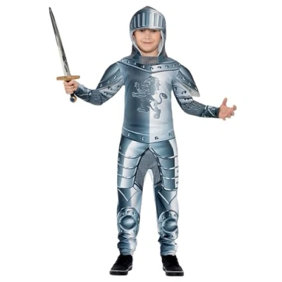 Smiffys Deluxe Armoured Knight Costume, Grey with Jumpsuit & Headpiece, Digital Print, Boys Fancy Dress, Child Dress Up Costumes