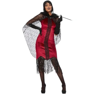 Smiffys Deluxe Vampire Flapper Costume, Red Dress & Sequin Cape, Halloween Adult Fancy Dress, 1920s Up Costumes