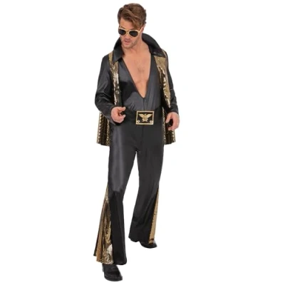 Officially Licensed Design: This Elvis Presley costume is officially licensed and designed to channel the iconic stage look of the King of Rock and Roll, making it a standout choice for fans and music lovers alike Bold and Iconic Look: Featuring a sleek black jumpsuit with shimmering gold panels, matching belt and a dramatic gold-lined cape, this costume brings to life Elvis’ unforgettable performance style in every detail Chest 38"-40",Waist 32"-34",Leg 32.75" Comfort and Style in One: Made from soft, stretchable fabric for a comfortable fit that allows easy movement, whether you're dancing, performing, or simply enjoying the party in style Perfect for Themed Events: A great choice for 70s fancy dress parties, Halloween celebrations, tribute acts, music-themed events or even stag nights where dressing to impress is a must Complete All In One Outfit: The costume includes a black jumpsuit with gold cape and printed belt so you can step into character instantly without the need for extra accessories, Manufacturer: Smiffys