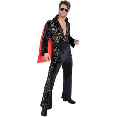 Includes Elvis Black Rhinestone Costume Printed Jumpsuit with Cape Chest 42"-44",Waist 36"-38",Leg 33" Our dedicated in-house Safety team ensure that all of our products are manufactured and rigorously tested to comply with the latest EU and American Safety standards and regulations. Smiffys is a leading fancy dress supplier and family business with a 125 year heritage in costumes, wigs, make up and accessories. Please note that all our Smiffys products will always come in full Smiffys branded packaging., Manufacturer: Smiffys