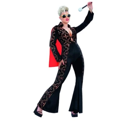 Includes Elvis Black Rhinestone Costume Printed Jumpsuit with Cape Bust37-38.5",Waist29-30.5",Hip39.5-41",Leg33.75" Our dedicated in-house Safety team ensure that all of our products are manufactured and rigorously tested to comply with the latest EU and American Safety standards and regulations. Smiffys is a leading fancy dress supplier and family business with a 125 year heritage in costumes, wigs, make up and accessories. Please note that all our Smiffys products will always come in full Smiffys branded packaging., Manufacturer: Smiffys