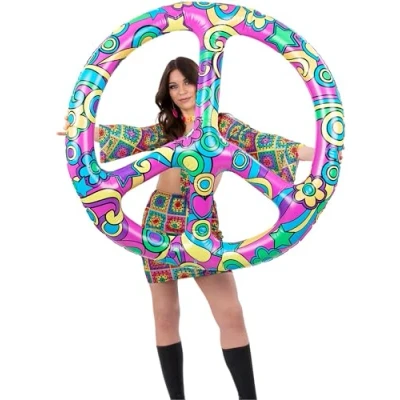 ICONIC 60S PEACE SIGN DESIGN: This giant pink inflatable CND symbol features bold psychedelic colours and a classic peace shape perfect for 60s or 70s themed fancy dress looks. OVERSIZED FOR MAXIMUM IMPACT: Measuring a huge 132cm in diameter this inflatable is great for statement photos fancy dress parties festivals and creating a retro vibe at events. LIGHTWEIGHT AND EASY TO INFLATE: Inflates quickly with air and deflates just as fast for convenient storage and reuse across multiple parties or costume occasions. PERFECT FOR GROUP COSTUMES AND PROPS: Makes a fun addition to hippie group outfits peace protests themed parades or as a background prop for festival photo booths. BRIGHT COLOURS AND DURABLE VINYL MATERIAL: Made from quality plastic with vibrant pink yellow and teal details this inflatable peace sign is both eye catching and long lasting., Manufacturer: Smiffys