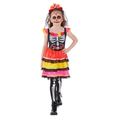 INCLUDES COLOURFUL DRESS AND HEADBAND – Day of the Dead outfit with multicoloured frills, flower bodice detail, and a matching floral headband with lace veil for a standout festive look VIBRANT DAY OF THE DEAD STYLE – Inspired by the traditional Día de los Muertos celebration, with skeleton print bodice and bright colours that bring Mexican heritage to life IDEAL FOR HALLOWEEN AND CULTURAL EVENTS – A fun and bold costume choice for trick-or-treating, school dress-up days, themed parties or carnival parades COMFORTABLE AND EASY TO WEAR – Soft fabric with a pull-on style for stress-free dressing; headband fits securely for hours of festive fun. Age 12+,Waist 27.5",Chest 33.5",Height 60-64" SIZING BY SMIFFYS – FANCY DRESS EXPERTS – Designed with attention to fit and detail by trusted costume specialists, available in a range of children’s sizes. Age 12+, Waist 27.5", Chest 33.5", Height 60-64", Manufacturer: Smiffys