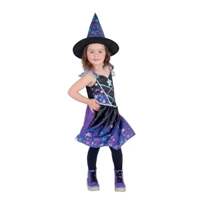 MAGICAL STAR DESIGN: Black and purple witch dress decorated with shimmering star print, colourful trims and criss-cross bodice detail for a spellbinding look COMPLETE COSTUME SET: Includes starry night witch dress and pointed matching hat, giving children everything they need for an enchanting Halloween outfit. Age 3-4 Toddler, Waist 21"-22", Chest 21.5"-22.5", Height 40"-45", weight to 38lbs HALLOWEEN ESSENTIAL: Perfect for trick-or-treating, school dress-up, themed parties and spooky celebrations, blending traditional witch style with fun sparkle COMFORTABLE AND EASY: Lightweight fabric and sleeveless design allow freedom of movement so kids can play, dance and celebrate without discomfort OFFICIAL SMIFFYS COSTUME: Crafted with high-quality materials and attention to detail, ensuring durability and a reliable fancy dress choice for Halloween fun, Manufacturer: Smiffys