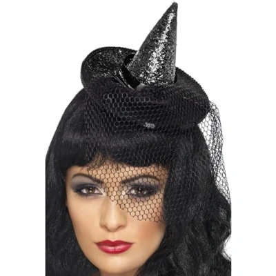 Smiffys Mini Witch's Hat, Black Glittered, on Headband with Netting, Halloween Fancy Dress Accessory, Witch Up Hats