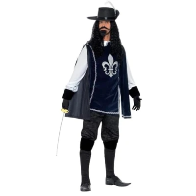 Includes Musketeer Male Costume, with Top, Hat, Navy Gloves, Boot Covers, Beard & Tash Chest 42"-44" / Waist 36"-38" / Leg Inseam 33" Our dedicated in-house Safety team ensure that all of our products are manufactured and rigorously tested to comply with the latest EU and American Safety standards and regulations. Smiffys is a leading fancy dress supplier and family business with a 125 year heritage in costumes, wigs, make up and accessories. Please note that all our Smiffys products will always come in full Smiffys branded packaging., Manufacturer: Smiffy's