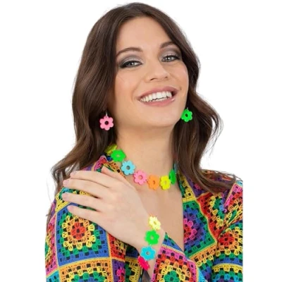 COMPLETE 3 PIECE ACCESSORY SET: This vibrant jewellery set includes matching neon flower earrings necklace and bracelet to create a coordinated retro hippie look in seconds. PERFECT FOR 60S AND 70S FANCY DRESS: Whether you're heading to a groovy disco or a peace and love festival this colourful set instantly elevates any vintage-inspired outfit. BOLD NEON FLOWER DESIGN: Features bright multicoloured flower-shaped charms that capture the essence of flower power and add a fun energetic vibe to your look. LIGHTWEIGHT AND EASY TO WEAR: Crafted from lightweight materials this set is comfortable for all-day wear and fits most adults for parties festivals or parades. IDEAL FOR GROUP COSTUMES AND EVENTS: Great for coordinated outfits hen dos or themed nights where standing out with bright accessories is all part of the fun., Manufacturer: Smiffys