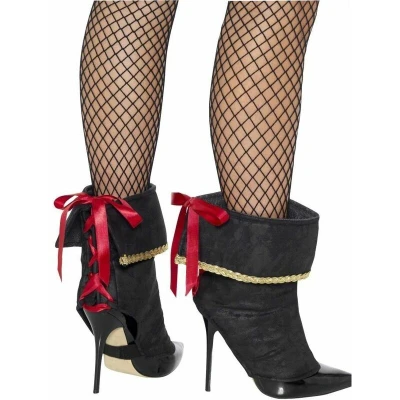 General description This pair of black pirate boot covers features a stylish lace-up back design, perfect for completing your pirate costume. Designed for adults, these accessories add a touch of authenticity to any fancy dress outfit. Technical specifications Color: Black Size: One Size Gender: Female Audience: Adult Other information This item is a fancy dress accessory for adults. It is not a toy. Warning: Keep away from fire.