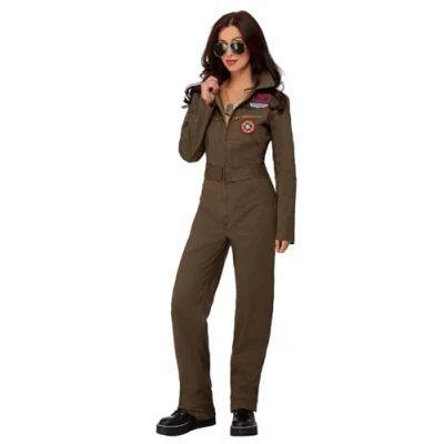Smiffys Top Gun Ladies Costume, Adults Khaki Jumpsuit, Official License Outfit with Applique Iconic Badges, Gathered Back for Comfort & Fit, Halloween Fancy Dress