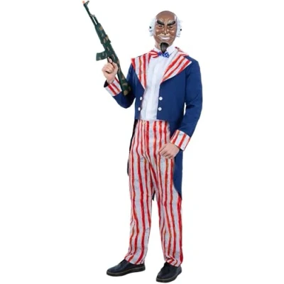 Includes Uncle Sam Horror Patriot Costume Jacket, Trousers, Bowtie & Mask Chest 46"-48" / Waist 40"-42" / Leg Inseam 33.25" Our dedicated in-house Safety team ensure that all of our products are manufactured and rigorously tested to comply with the latest EU and American Safety standards and regulations. Smiffys is a leading fancy dress supplier and family business with a 125 year heritage in costumes, wigs, make up and accessories. Please note that all our Smiffys products will always come in full Smiffys branded packaging., Manufacturer: Smiffys