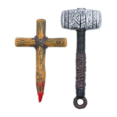 COMPLETE SLAYER ACCESSORY KIT: Includes one wooden effect stake with blood detail and one silver gothic style hammer giving you everything you need to complete a vampire hunter look. REALISTIC AND THEATRICAL DESIGN: The stake features blood stained tips and wood grain texture while the hammer has engraved runes and a leather effect handle for extra drama. PERFECT FOR HALLOWEEN AND ROLE PLAY: Ideal for vampire themed costumes gothic characters or monster hunters this set brings a spooky edge to any fancy dress look. SAFE AND LIGHTWEIGHT MATERIALS: Made from durable lightweight plastic these props are child friendly and safe for use at parties haunted houses or theatrical performances. EASY TO CARRY AND REUSE: Each piece is compact easy to transport and can be reused for multiple events from Halloween to cosplay conventions and horror themed parties., Manufacturer: Smiffys