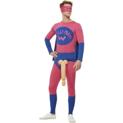 Includes Willyman Superhero Costume, Pink & Blue with Bodysuit, Eyemask & Overpants Chest 38"-40" / Waist 32"-34" / Leg Inseam 32.75" Our dedicated in-house Safety team ensure that all of our products are manufactured and rigorously tested to comply with the latest EU and American Safety standards and regulations. Smiffys is a leading fancy dress supplier and family business with a 125 year heritage in costumes, wigs, make up and accessories. Please note that all our Smiffys products will always come in full Smiffys branded packaging., Manufacturer: Smiffys