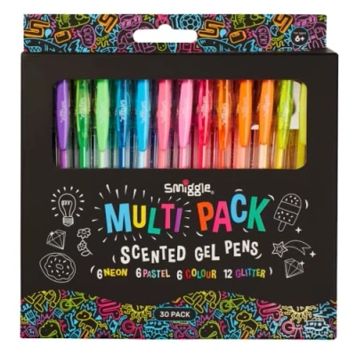 Bumper pack of 30 scented gel pens in a huge range of fun colours. Gel ink ballpoint pens with rollerball nib and removable clip top. Choose from 6 x bright neon, 6 x bold colour, 6 x pastel and 12 x glitter coloured pens. Sweetly scented too! Each pen approx 15cm. Box size approx 17 x 15.5 x 3cm. Suitable for age 6+. Unit count: 1.0