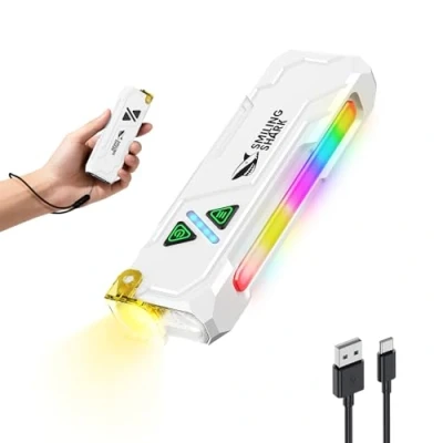【Unleash Powerful Brightness, Shine Farther and Clearer】Powered by a high-performance Flat XPL LED, the Smiling Shark ML01 shines with an impressive 680 lm and projects a clear, focused beam up to 105m—bright enough to light your path on the darkest trails or illuminate an entire backyard. Whether you need intense brightness for outdoor adventures, a softer glow for reading in a tent, or a strobe for emergency signaling, the five versatile modes ensure you always have the right light for the moment. With this flashlight, you’re not just carrying brightness—you’re carrying confidence wherever you go. 【Hands-Free Power & Easy Control Anywhere】 Thanks to the powerful tail magnet, ML01 can stick securely to any metal surface, giving you true hands-free lighting for tasks like car repairs, camping, or DIY projects. Meanwhile, two independent buttons let you control the main beam and the side RGB light separately, so you can switch modes effortlessly without fumbling—perfect for creative lighting, signaling, or setting the right mood anywhere. 【Multi-Mode Flashlight with U V & RGB】 Experience total lighting flexibility which included 20 Brightness & Color Modes with the ML01. Its main beam adjusts across 4 brightness levels, letting you go from gentle indoor illumination to powerful outdoor visibility. The side light opens up a spectrum of possibilities—dynamic RGB and Red strobe for signaling and emergencies.Besides, it features a powerful U V light with high intensity and radiant energy, making it ideal for detecting pet stains, scorpions, and other hidden traces. 【Recharge in 2 Hours, Shine Up to 30 Hours】Never worry about running out of power with the ML01’s built-in 1000mAh rechargeable battery. With overcharge and over-discharge protection, it keeps your flashlight safe and reliable. A full charge takes just around 2 hours, giving you up to 30 hours of bright illumination depending on the mode. Four LED indicators let you see exactly how much power is left, so you’re always in control and ready for work, camping, hiking, or emergency situations. 【Compact Design, Built to Last, Versatile for Every Task】Built for adventure, the ML01 features a sturdy aluminum alloy body in a lightweight 106g design, making it easy to carry. Its convenient clip lets you attach the flashlight securely to your backpack, belt, or gear, keeping your hands free wherever you go. Combined with a yellow diffuser and silicone lanyard, this rugged, water-resistant, and impact-tested flashlight is ready for hiking, camping, fishing, or any outdoor challenge—reliable whenever you need it most.