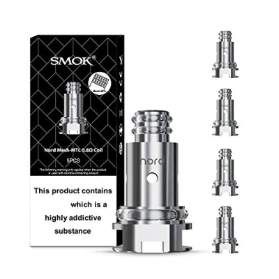 No Nicotine Pack of 5 SMOK Nord Replacement Coils with 0.8ohm resistance, optimized for Mouth-to-Lung (MTL) vaping. Crafted from high-quality materials for durability and consistent performance. Easy installation process ensures hassle-free coil replacements, enhancing convenience for users. Works With Nord Pro kit Nord 50W kit (Nord 50W empty Nord pod) Priv N19 Kit, Vape pen Nord 19 Kit, Vape pen nord 22 Kit, Nord Aio 19 Kit, Nord Aio 22 Kit, Alike Kit (Alike Empty Nord Pod), Nord 2 Kit (Nord 2 Nord Pod), Fetch Mini Kit (Fetch Mini Empty Nord Pod), Nord Kit, Stick N18 Kit